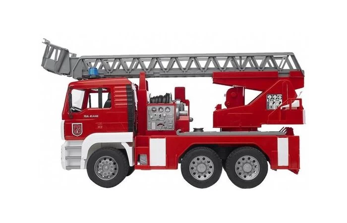 De kantelbare cabine van de MAN brandweerwagen met draaischijfladder en waterpomp biedt zicht op het motorblok. De spiegels van de cabine kunnen worden uitgeklapt en de geïntegreerde watertank kan worden gevuld. De waterslang kan worden opgewonden en heeft aan het uiteinde een volledig functionele waterspuit. De draaitafelladder incl. reddingsmand kan worden verlengd met een handwiel en in hoogte worden verstegesteld. Vier steunblokken zorgen voor een veilige standaard. De Licht- en Geluidsmodule Art.-Nr.: 02801 met vier verschillende functies claxon, motorgeluid, knipperlicht en sirenegeluid is inbegrepen in de leveringsomvang. Loopvlakbanden maken het plaatje compleet.