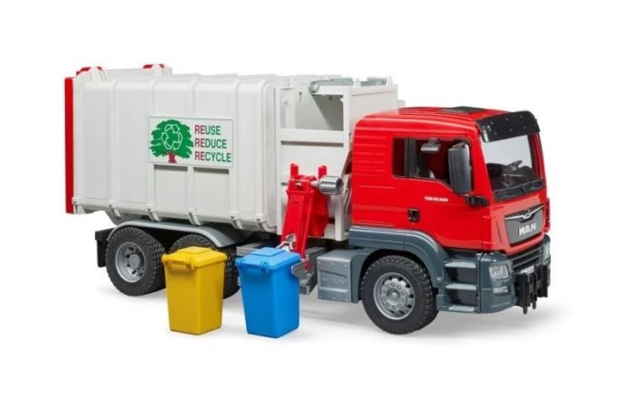 De MAN TGS vuilniswagen zijlader van bruder is gedetailleerd speelgoed voro kinderen om op realistische wijze de spannende taken van afvalinzameling en -recycling te ontdekken, net als het echte werk.