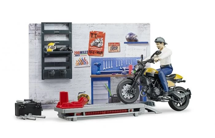 Bedrukte wandelementen met eenvoudig te monteren verstelbare voeten vormen nu de ruimte voor nog meer realiteit tijdens het spelen en het nieuwe rekkensysteem kan ook interageren met de elementen. De bworld motorfiets werkplaats is een paradijs voor vetapen. De gedetailleerde Scrambler Ducati Scrambler Full Throttle is bevestigd op het hefplatform met beugels voor onderhoud. De monteur beschikt over een gereedschapskist met uitgebreide apparatuur tot zijn beschikking. Hij kan zijn helm en handschoenen op de wandplanken bewaren totdat ze nodig zijn voor de proefrit. De bworld motorfiets workshop kan gemakkelijk worden gecombineerd met de andere bworld thema sets. Uit de grote selectie van grote Bruder voertuigen, de RAM Power Wagon met Scrambler Ducati Desert Sled (item nr. 252) en de Land Rover StationWagon met trailer en Scrambler Ducati Full Throttle (item nr. 2589) zijn vooral goede wedstrijden voor de nieuwe bworld motorfiets workshop.