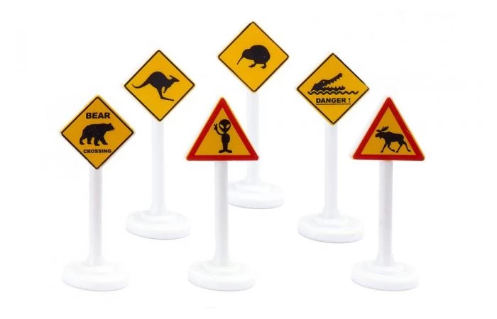 Verkeersborden vragen in landelijke gebieden om speciale aandacht voor koeien op de weg en in het bos voor overstekend wild. Er wordt echter wereldwijd met SIKU voertuigen gespeeld. Vanzelfsprekend wordt in andere landen gewaarschuwd voor andere dieren op of naast de weg: beren, elanden, kangoeroes, kiwi’s, krokodillen. En als er eens een UFO landt, zwaait de buitenaardse bezoeker vriendelijk naar je. De borden zijn uitgevoerd in hoogwaardig kunststof van beproefde SIKU kwaliteit en zijn bijzonder robuust en staan stevig. Met de internationale waarschuwingsborden gaan de SIKU voertuigen en SIKUWORLD op ontdekkingsreis naar verre landen en continenten.