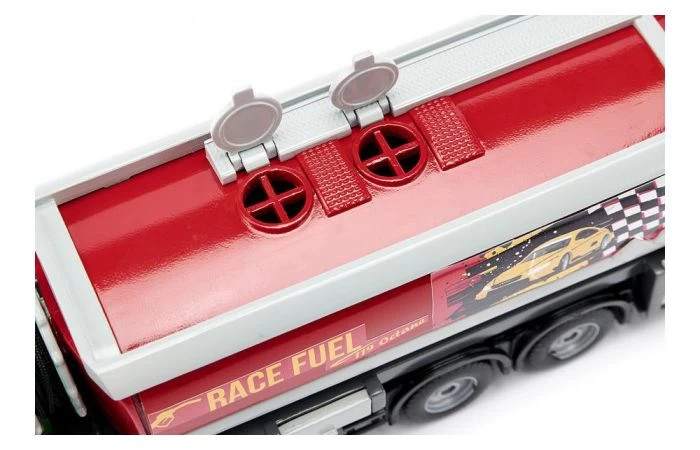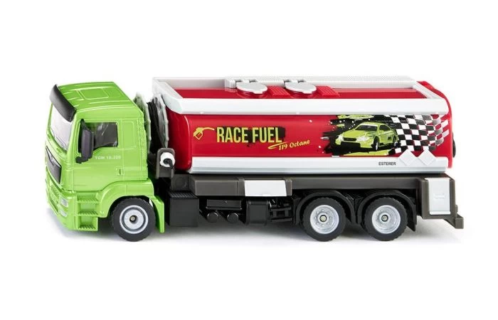 De naald van de brandstofmeter gaat bijna helemaal naar nul. Tijd om de SIKU supersportwagen bij te tanken. De nieuwe MAN TGM met tankopbouw van Esterer brengt de brandstof naar het benzinestation. Het hoogste octaangetal voor de Bugatti, Lamborghini en Co. Met behulp van de opgerolde slang achter de chauffeurscabine zijn ook de verder gelegen tankaansluitingen te bereiken. De tank kan via de kleppen op het bovenste deel worden gevuld. De technische delen van de installatie zijn via de vele kleppen op het voertuig te bereiken. De kunststoftank is veilig op het stevige drie-assige chassis van zink en de metalen cabine opgebouwd. De MAN met tankwagenopbouw is de perfecte aanvulling voor de SIKUWORLD sets Stad (5501) en de Werkplaats (5507) of voor gebruik in de steengroeve als mobiele brandstofpomp voor de Liebherr T264 dumper (1807) en de Liebherr R9800 mini-graafmachine (1798).