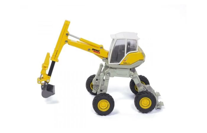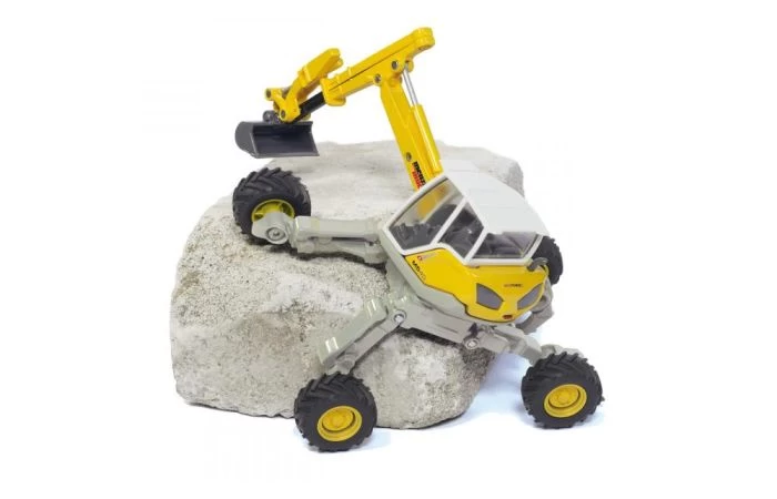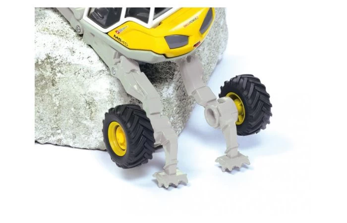 Het chassis met poten die als een spin kunnen worden versteld heeft ook grip in moeilijk begaanbaar terrein. De meervoudig beweegbare graafarm kan telescopisch worden uitgeschoven en is verbonden met de 360^0 draaibare cabine. Het grotendeels metalen model is voorzien van de typische Menzi-Muck kleuren.