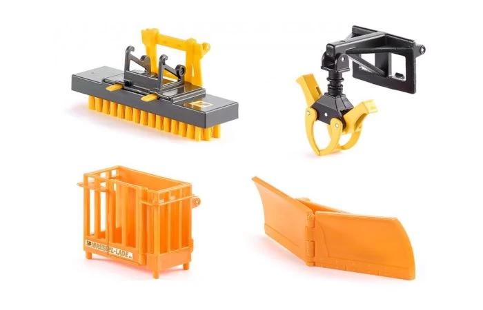 De serie aanbouwmachines voor SIKUFARMER32 tractoren met frontloader wordt met deze bijzondere set verder uitgebreid. De set bestaat uit een werkplatform, een sneeuwschild, een veger en een boomstamgrijper. Het werkplatform is bovendien voorzien van een deur. Het sneeuwschild kan naar links en rechts worden bewogen en de boomstamgrijper is voorzien van een pendelend opgehangen grijper. Een bijzonderheid van de veger is de meegeleverde palletvork. Hieraan kan de veger worden bevestigd. De armen van de nieuwe palletvorken voor de frontloader Fendt 939 Vario (#6778) uit de SIKUCONTROL serie passen ook op de bevestiging van de veger.