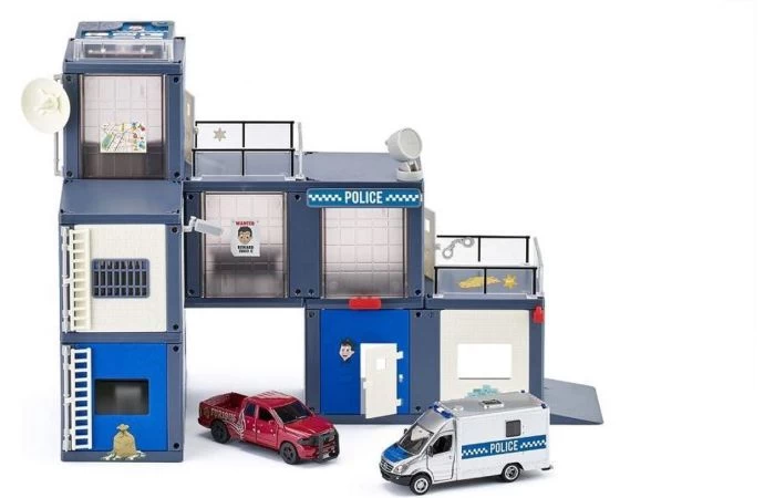 De binnenplaats van de gevangenis is fel verplicht. De politie komt aan met een Mercedes-Benz Sprinter met gesloten opbouw, de agenten gaan een schotenwisseling aan met de gangsters en raken de grote pick-up in de zijdeuren. De gangsters kunnen desondanks toch vluchten. Met de Light & Sound module ontstaat een scène in de SiKUWORLD die in een film niet zou misstaan. SIKUWORLD groeit verder met het nieuwe politiebureau. Het gebouw van drie verdiepingen kan aan de hand van de duidelijk geïllustreerde handleiding in elkaar worden gezet. Uit de bouwelementen ontstaan ook bijzondere en individuele gebouwen in L- of U-vorm maar er ontstaan ook gebouwen van meerdere verdiepingen. Door de modulaire opbouw en de stevigheid van de steekverbindingen kunnen de kinderen hun creativiteit zonder beperkingen botvieren. Door het siku steeksysteem worden hierbij spelenderwijs de motorische en cognitieve vaardigheden van het kind ontwikkeld. De mogelijkheid om iets te maken zonder hulp van volwassenen versterkt bovendien het zelfvertrouwen.Het politiebureau is compatibel met de andere sets van SIKUWORLD maar er kan ook zelfstandig mee worden gespeeld. Meegeleverd worden de bouwelementen zoals de wanden met tralies voor de ramen voor de verblijfs- en dienstvertrekken van de politie en het celblok. Het gebouw van drie verdiepingen met dakterras is zoals typisch voor siku gedetailleerd uitgerust met een antenne, valdeur, ladders een nagloeiende zoekschijnwerper, een satellietinstallatie, tafel en stoelen en een bewakingscamera. Vanzelfsprekend kunnen de voertuigen met de vele politievoertuigen van siku worden uitgebreid. installatietijd: 30 minuten