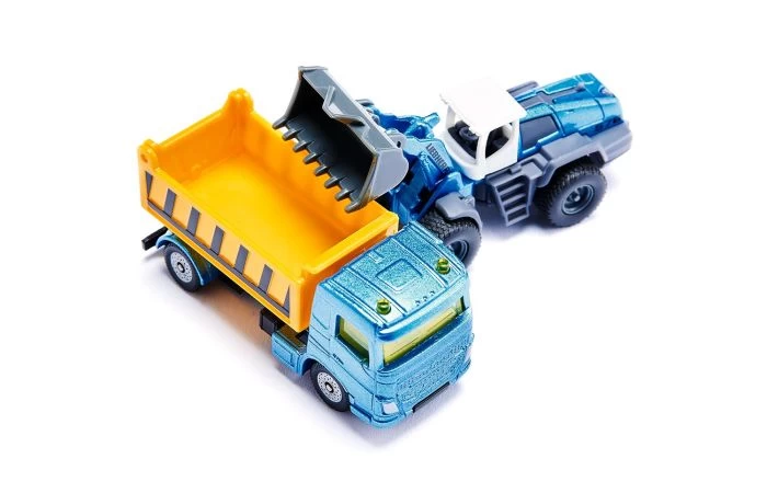 Voor een nog realistischer speelervaring zorgt de siku cadeauset bouwplaats met drie van de belangrijkste voertuigen op de bouwplaats: de zware vrachtwagen met de grote laadbak voor aan- en afvoer van bouwmateriaal en accessoires, de vorkheftruck met de kranige hefarmen die ook de zwaarste lasten schijnbaar zonder moeite omhoog brengt en verplaatst, en tenslotte de wiellader, een krachtige bouwmachine met grote graafschop waarmee hij bouwpuin, zand en stenen in no-time uitlaadt en vervoert. In stralend blauwe Kingfisher Blue Metallic-lak maken de drie bouwvoertuigen duidelijk: wij zijn een team en samen kunnen we alles – laten we aanpakken!