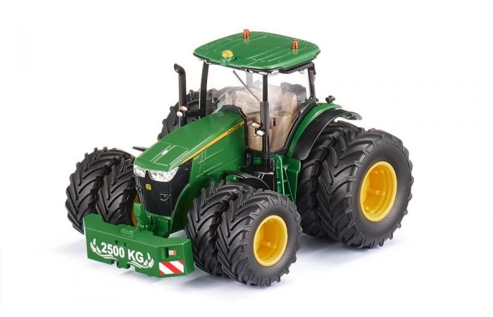 Met de app bestuurbare tractor met dubbele bandenModerne tractoren zijn uitgerust met digitale techniek om het land zo efficiënt mogelijk te bewerken. Ook bij de nieuwe SIKUCONTROL John Deere 7290R wordt gebruikgemaakt van de nieuwste digitale techniek: De tractor wordt bestuurd met een smartphone of tablet. De SIKU app en de Bluetooth technologie maken het mogelijk. De vele functies van de tractor garanderen veel speelplezier voor jonge en jong gebleven tractorbestuurders. De krachtige vertegenwoordiger van de nieuwe 7R serie van John Deere is door de dubbele banden een indrukwekkende verschijning. Door de dubbele banden wordt bij zachte grond de druk van de tractor gereduceerd. De banden worden gemonteerd met behulp van magneten die in de velgen zijn geïntegreerd en zorgen voor een stevige verbinding. Deze technologie is tot nog toe uniek voor op afstand bestuurde tractoren. Hierdoor kan het monteren en verwijderen van de banden zeel snel zonder gereedschap worden uitgevoerd. De John Deere 7290R kan met de gebruikelijke banden aan de voor- en achteras, met dubbele banden rondom of alleen dubbele banden achter worden gereden. De SIKUCONTROL-tractor van metaal en kunststof onderscheidt zich niet alleen door de talrijke features maar ook door de aandacht voor details die de fans weten te waarderen. Alle functies en de drie transmissies van de tractor kunnen via de app worden bediend, of naar keuze ook via de virtuele joystick bediening of de bewegings- en kantelsensoren van het mobiele apparaat. Deze intuïtieve feature is een welkome afwisseling bij het spelen. Met de app is nauwkeurig rangeren mogelijk en de aanhanger en de aanbouwapparaten kunnen worden gekoppeld. De koppeling achter wordt elektronisch aangestuurd. Met de app kunnen de rijverlichting op de motorkap, de werkschijnwerpers aan de cabine, de knipperlichten achter en de verlichting rondom worden geschakeld. De SIKU-app geeft tractorfans daarnaast nog interessante informatie over de John Deere 7290R tractor. Het is ook mogelijk om een naam voor de tractor op te slaan. De instellingen en functies van de app worden permanent bijgewerkt. Met behulp van de OTA (Over-The-Air)-functie van de app kunnen software-updates voor de tractor direct worden geïnstalleerd. Als alternatief voor de SIKU APP kan de tractor via de Bluetooth module voor de afstandsbediening worden bestuurd.