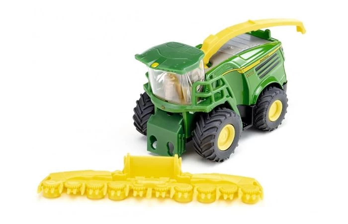 De indrukwekkende John Deere 8500i maïshakselaar vreet zich meter voor meter door het maïsveld. SIKU presenteert het nieuwe model in de serie 8000 van metaal en kunststof nauwkeurig op schaal 1:87. De grote, massieve rubberen banden met het zware noppenprofiel banen zich ook onder zware terreinomstandigheden een weg. Speelgoed boeren zijn enthousiast over de detaillering. Het maïs-opzetstuk is afneembaar en kan voor transport naar het volgende maïsveld worden opgeklapt. De zogenaamde losvijzel waarmee de gehakselde maïs op de klaarstaande agrarische aanhanger van SIKU wordt geladen, is beweegbaar.