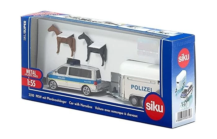 Zeer gedetailleerd politiebusje met paardentrailer met 2 paarden. Zowel het busje als de trailer hebben deuren die open en dicht kunnen.